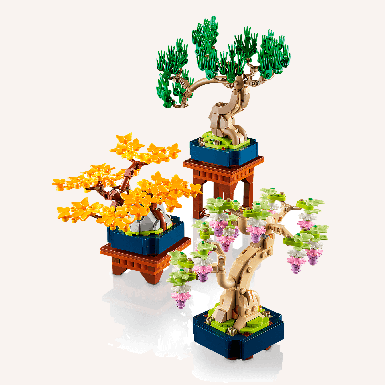 Atpūties un relaksējies, būvējot trīs cēlus bonsai kociņu modeļus: ginku ar dzeltenām lapām, melnu priedi ar zaļām skujām un vistēriju ar nokareniem ziediem ceriņu krāsā. Katram mini kociņam ir maināma lapotne, tāpēc vari piesaukt savu iekšējo bonsai mākslinieku un pielāgot uzbūvētos modeļus, mainot to lapas. Komplektā ir arī divi dekoratīvi statīvi, kas ļauj bonsai kociņus izlikt apskatei dažādos augstumos un dažādās kombinācijās, padarot tos par brīnumskaistiem dekoratīvajiem augiem.